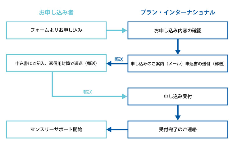 ※お支払いはクレジットカード/銀行・ゆうちょ銀行引き落としに限らせていただいています。 - プランにて申込用紙受領後、受付完了のご連絡を差し上げます(メール)。