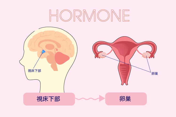 女性ホルモンは、脳の「視床下部」から指令が出て、それが「卵巣」に伝わることで卵巣から血液中に分泌されます。