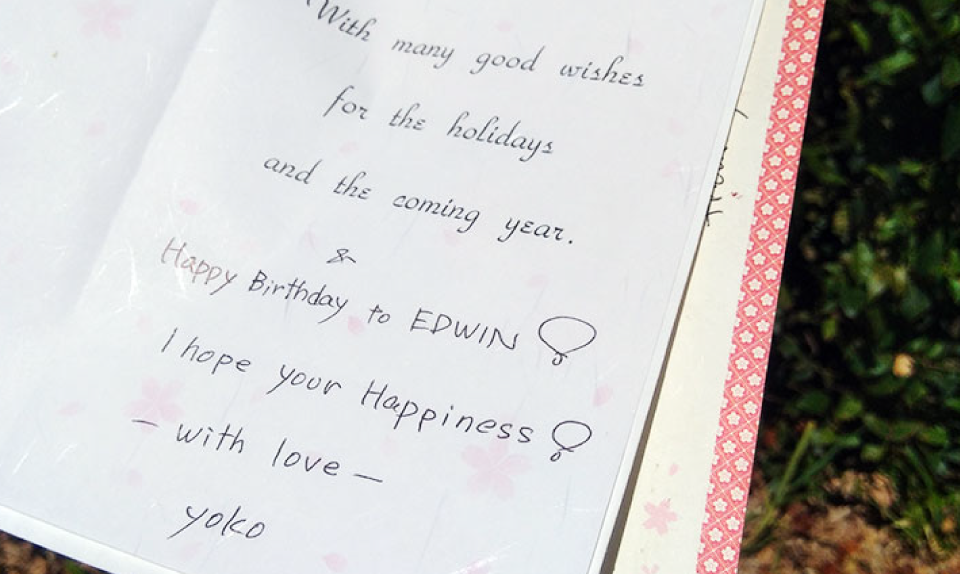 思い出に残っているのは、手紙に書かれた「We love you Edwin. We wish to see you some of the day.」というメッセージ。とても温かい気持ちになったのを覚えています。開けると音の鳴る誕生日カードには私もコミュニティのみんなもびっくりしました!私はこのカードのおかげでちょっとしたヒーローになれたんです。