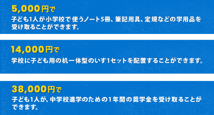 - *上記は例です。いただいたご寄付は、他の取り組みや管理費にも充てさせていただきます
