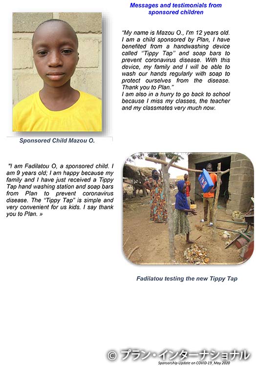 「私はチャイルドのFadilatou O、 9歳です。新型コロナウイルス(COVID-19)感染予防のためプランが“Tippy Tap”という簡易手洗い場を設置してくれて、石けんも受け取り、とてもうれしいです。“Tippy Tap”は私たち子どもにとって、簡単でとても便利です。ありがとうございます」