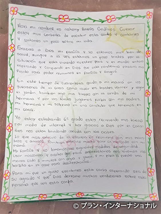 こんにちは、私の名前はナホミです。この手紙を通じて私の生活についてお話しできることをとてもうれしく思います。神に感謝します。私と家族は元気で健康ですが、同時に私の国や世界の国々が直面している状況は少し悲しいです。このパンデミックが間間もなく終わることを信じ、終わったときに親戚や友だちと再会できることを心待ちにしています。この隔離期間中は、お皿を洗う、床を掃除する、庭に水をやるなどの家事をして母を手伝っています。私は現在6年生で、隔離期間中はオンラインで授業を受けています。ローカルテレビで授業を受けられることを神に感謝しています。一番寂しいのは、先生や友だちと学校で会えなくなったことです。そして、母と一緒に市場に行くこともできなくなり、悲しいです。私と家族は、次の感染対策を実施しています。私たちはマスクを着用し、消毒剤で消毒します。また、毎回、手を洗うときは水と石けんで5分洗います。父は殺菌するための水を屋外に設置しました。