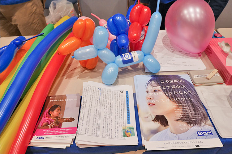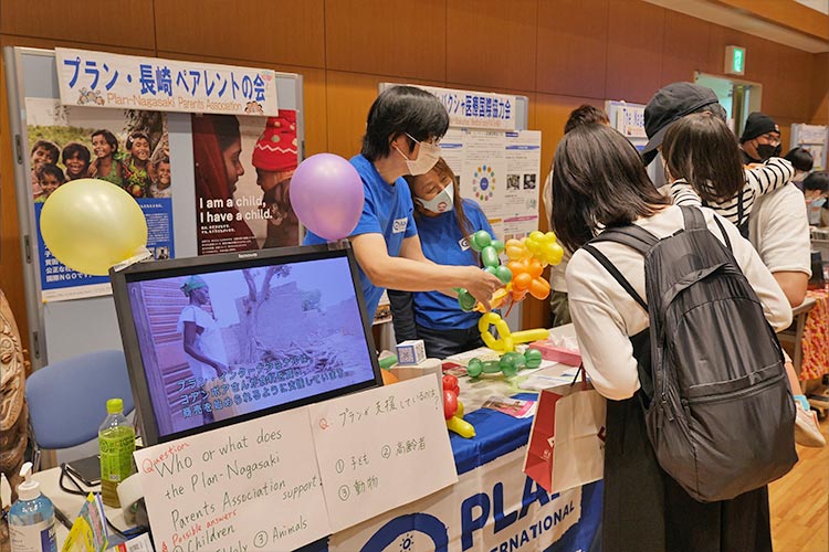 私たちは、スタンプラリー形式で訪れた方々に、ポスターとビデオでプラン・インターナショナルを紹介、プランのパンフレットや長崎の会の活動紹介のチラシ130枚、子どもにはステッカーを貼った風船約100個を配りました。
