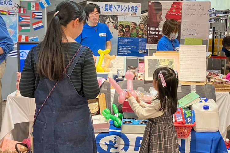 私たちは、ポスターやビデオで「プラン・インターナショナル」と「プラン・長崎ペアレントの会」の活動紹介とチラシの配布、ステッカーを貼ったバルーンや朝顔の種などを配りました。バルーンは2018年に始めましたが、子どもたちに大人気でバルーン待ちの列ができるほどでした。子どもをつれた親御さんに説明をするというパターンでパンフレットを渡すと「(プランを)テレビで見たことがある」という方が何人もいらっしゃいました。