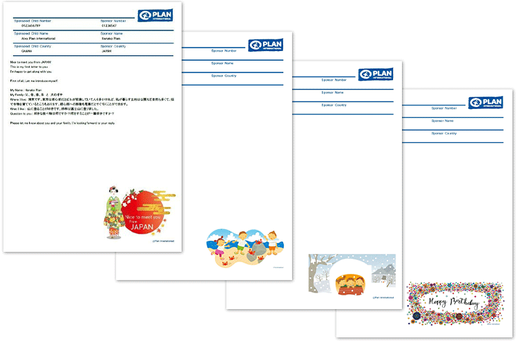 チャイルドの誕生日、そして身近にうれしいことがあった日など、年2~3回、チャイルドへお手紙を書いてはいかがでしょう。遠い国に暮らすチャイルドとのやり取りをお楽しみください。