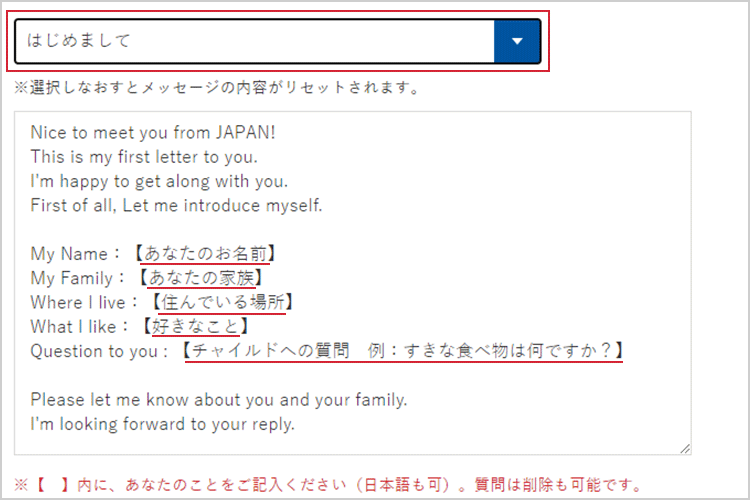 「私には姉妹がいます」「美術が得意です」「魚を好んで食べます」「太極拳をしています」と自分の身の回りを紹介しつつ、チャイルドに「あなたは?」と聞くなど、コミュニケーションが続くような手紙を送ります。
